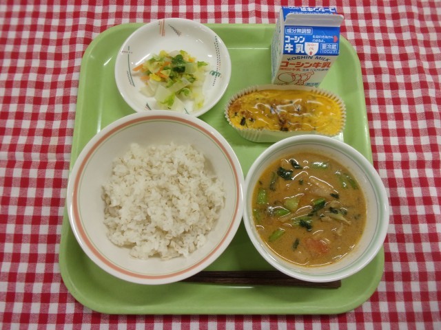 今日のメニューは、麦ご飯、中華風卵焼き、ラーパーツアイ、小松菜の坦々スープ、牛乳です。