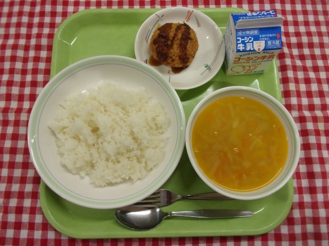 今日のメニューは、ガーリックライス、カトレット、ダールスープ、牛乳です。