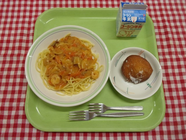 今日のメニューは、スパゲティーあけぼのソース、かぼちゃのソース、牛乳です。