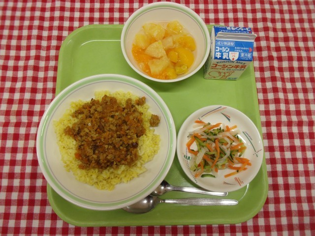 今日のメニューは、ドライカレー、野菜のピクルス、サイダーポンチ、牛乳です。