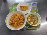 ターメリックライススープカレー小松菜入りツナサラダ牛乳スープカレーは、北海道が発祥の料理といわれています。給食でも、野菜と鶏ガラでダシをとり、ハーブやスパイスなどを加えて作りました。