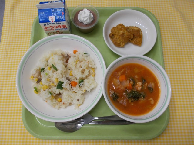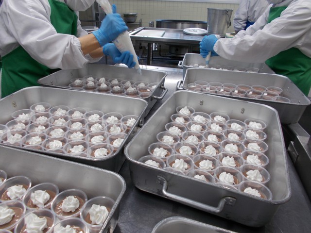 ココアゼリーの上には、ホイップクリームを絞りました。調理員さんの手作業で、ひとつずつ絞っています。