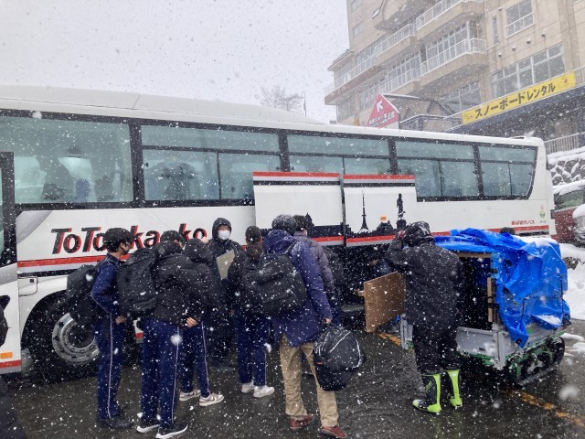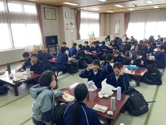 岩原スキー場に到着しました。入所式を行いました。その後、持ってきたお弁当を食べています。