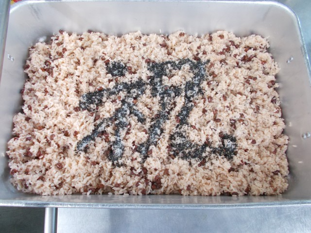9年生のお赤飯は黒ごまで「祝」の文字を書きました。