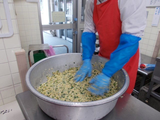 写真2:ひき肉と野菜をこねています
