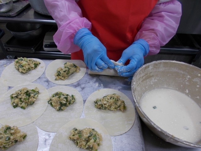 ジャンボぎょうざは、ひき肉・キャベツ・玉ねぎ・ニラ、にんにく・生姜を合わせて作った具をよく練り、餃子の皮で包んで油で揚げました。
