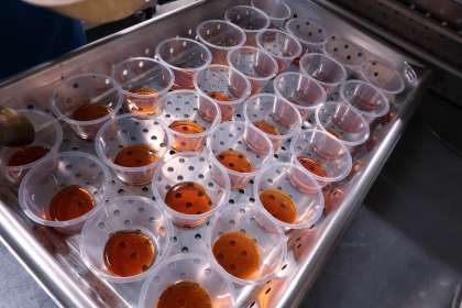 丁寧にカップに入れ、プリン液を流して、オーブンで蒸しました。