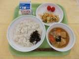 根菜のドライカレー フレンチサラダ さつまいもドーナッツ 牛乳 今日の「さつま...