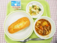 <本日の献立>ごまはちみつトースト、冬野菜のクリーム煮、ごぼうのカミカミサラダ、牛乳 「冬野菜のクリーム煮」には、白菜、かぶ、ブロッコリー、にんじんなどの冬野菜や、さつまいもなどが入っています。大きめ...
