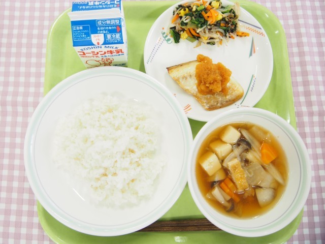 ご飯、さばのおろしポン酢かけ、磯和え、けんちん汁