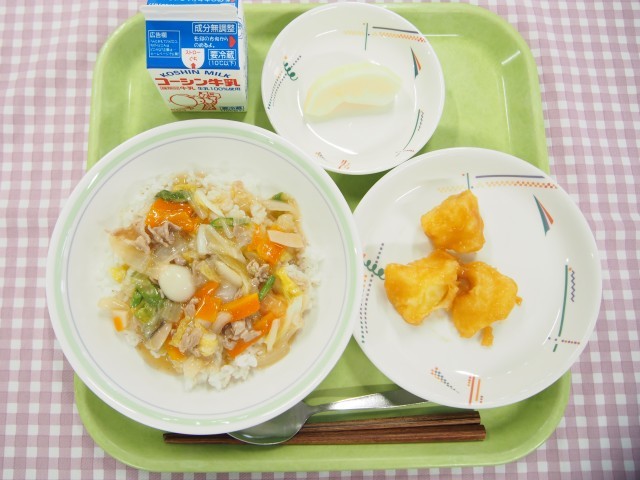 今日のデザートは、秋が旬の「りんご」です。“1日1個のりんごで医者いらず”という言葉があるように、健康によい食べ物といわれています。りんごには、お腹の調子を整えたり、がんを予防したりする効果があります。