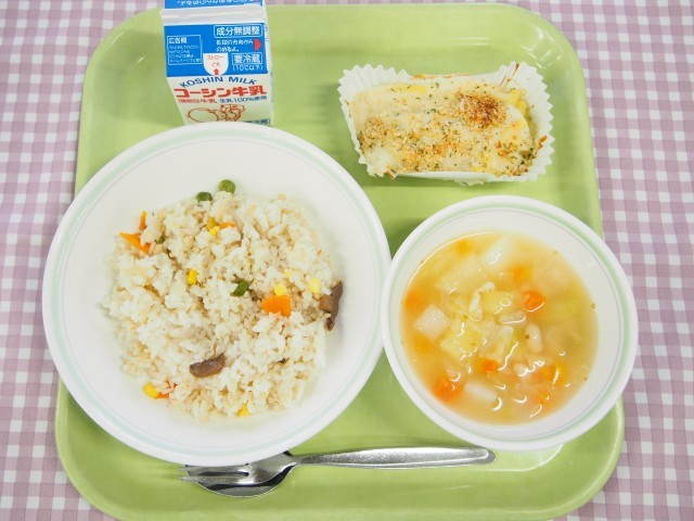 コーンピラフ、白身魚のグラタン、ペイザンヌスープ、牛乳