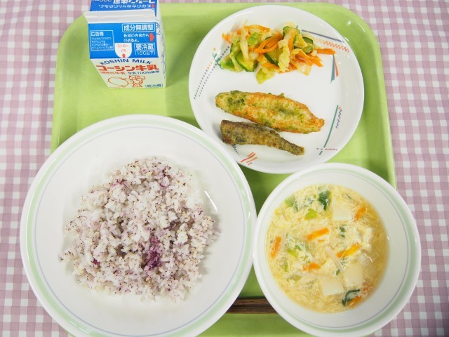 ゆかりごはん、笹かまぼことメヒカリの磯辺揚げ、野菜のピリ辛和え、かき玉汁、牛乳