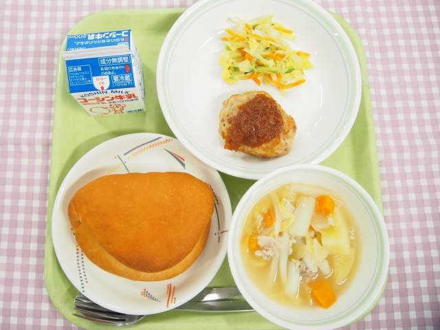 今日の「セルフハンバーガー」は、具を組み合わせて自分でハンバーガーを作ります。パンが二つ折りになっているので、パン同士をはがして、ハンバーグを挟んで食べます。サラダを一緒に挟んでも美味しいです。ハンバーグは、給食室で手作りしたもので、豚ひき肉と豆腐、みじん切りにした玉ねぎなどをこね合わせて、1つ1つ丸く成形して焼きました。