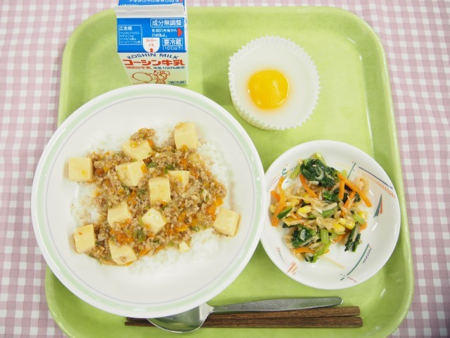 マーボー豆腐丼、切り干し大根のサラダ、おかしな目玉焼き
