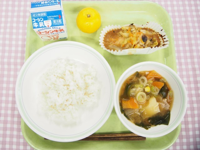 ごはん、鮭のチャンチャン焼き、どさんこ汁、みかん、牛乳