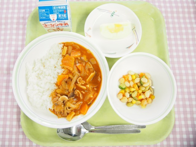 ハヤシライス、ビーンズライス、りんご、牛乳