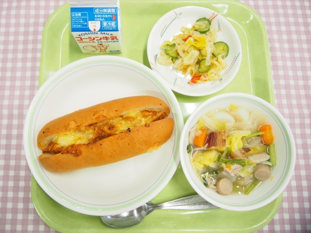 チリビーンズドッグ、秋味ポトフ、カラフルサラダ、牛乳