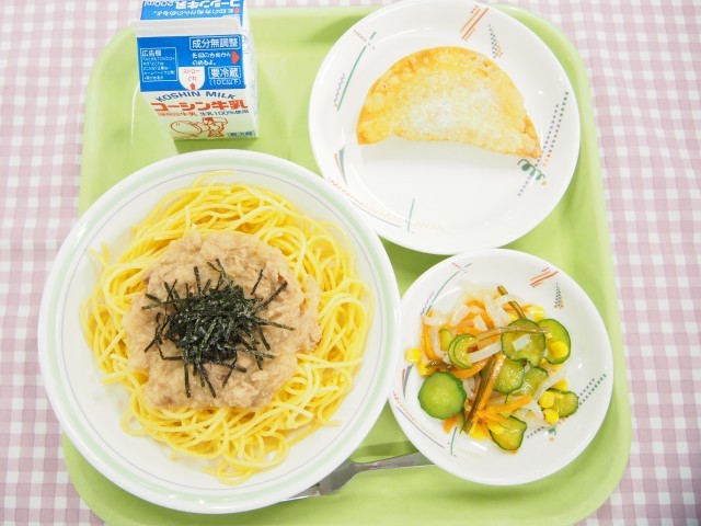 スパゲッティーおろしソース、こんにゃくのサラダ、さつまいもとりんごのパイ、牛乳