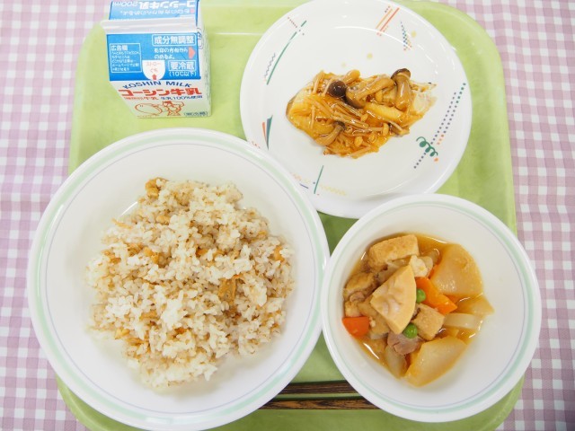 しょうがご飯、魚のきのこあんかけ、板橋区産大根の煮物、牛乳