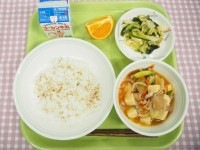 青菜チャーハン、いかのチリソース、ワンタンスープ、牛乳