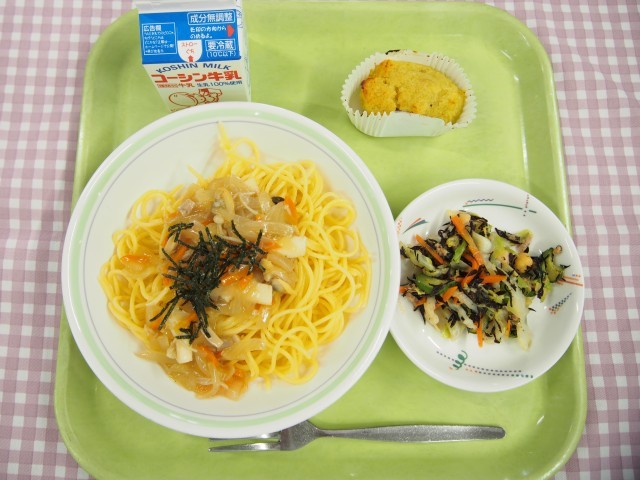 和風スパゲッティー、ひじきとツナのサラダ、スイートポテト、牛乳
