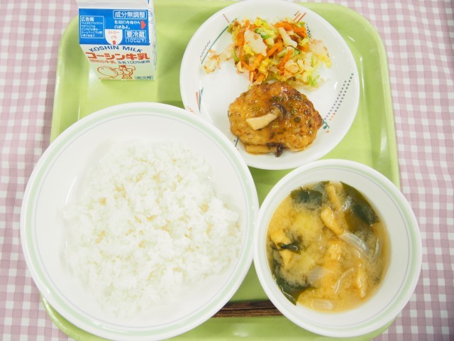 ごはん、和風おろしハンバーグ、土佐酢和え、じゃがいもとわかめのみそ汁、牛乳
