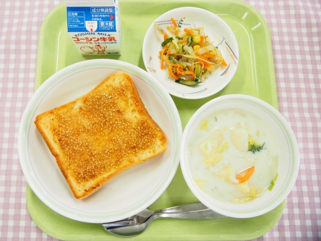 ごまはちみつトースト、冬野菜のクリーム煮、ごぼうのカミカミサラダ、牛乳