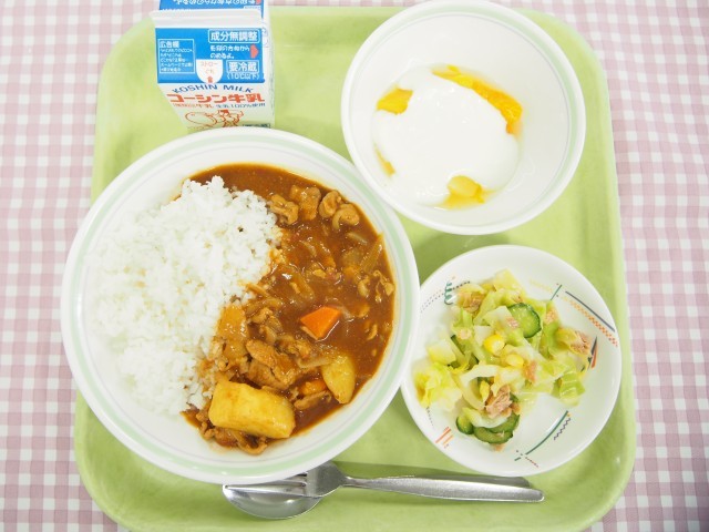 カレーライス、ツナサラダ、フルーツヨーグルト、牛乳