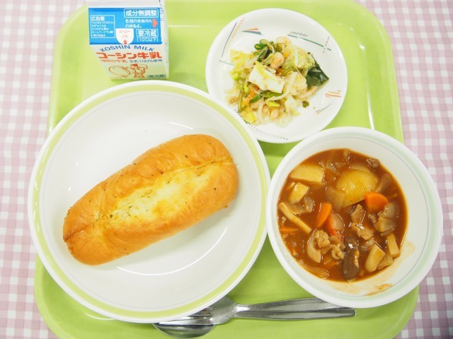 ガーリックフランス、豚肉と野菜のデミグラスソース煮、シーフードサラダ、牛乳