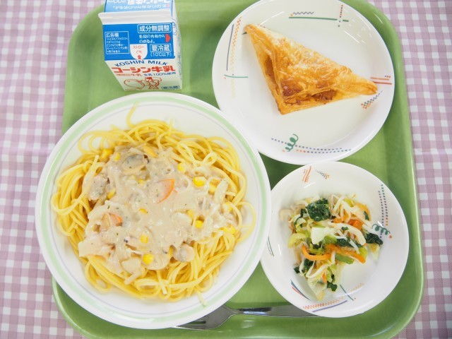 あさりのクリームスパゲッティー、オニオンドレッシングサラダ、アップルパイ、牛乳