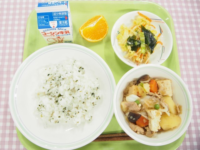 磯ごはん、じゃがいものすき焼き煮、和風サラダ、みかん