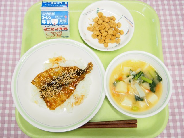 鰯のかば焼き丼、みそけんちん汁、大豆のかりんとう、牛乳