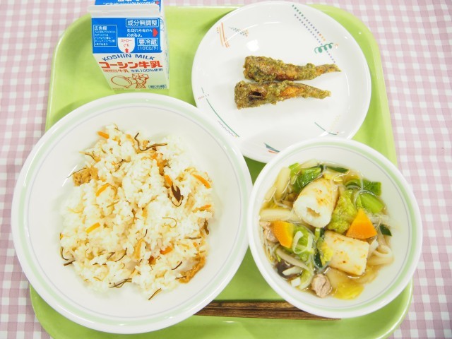 昆布ごはん、メヒカリの磯辺揚げ、きりたんぽ汁、牛乳