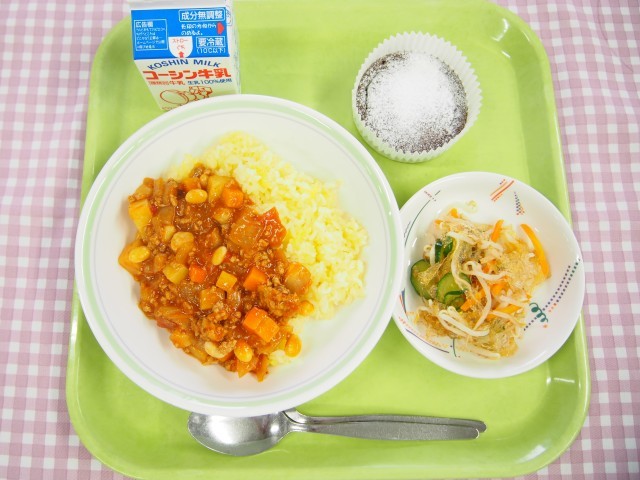 チリビーンズライス、糸寒天のサラダ、米粉のチョコレートブラウニー、牛乳