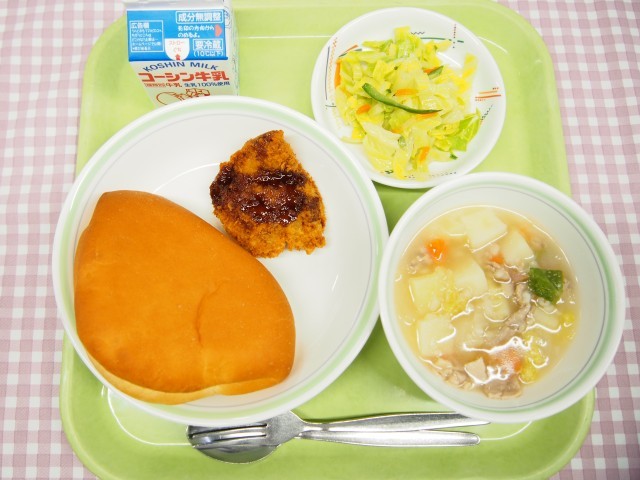 セルフカツサンド、コールスローサラダ、じゃがいもと押し麦のスープ、牛乳