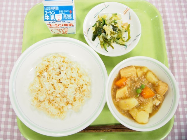 鯛めし、生揚げとじゃがいものそぼろ煮、海藻サラダ、牛乳
