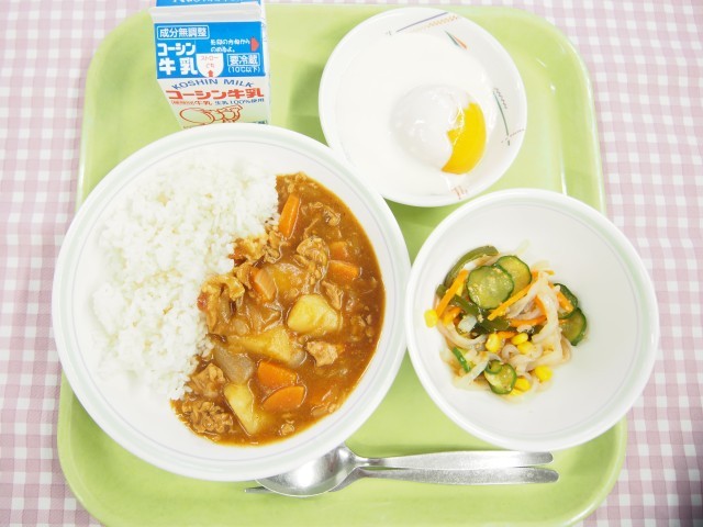カレーライス、こんにゃくのサラダ、ピーチヨーグルト、牛乳