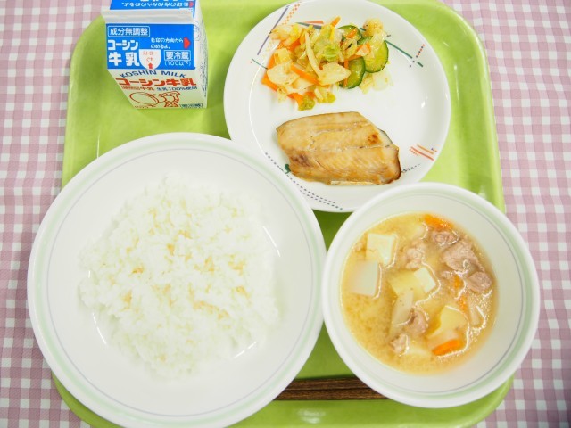 ごはん、鰆の照り焼き、野菜のピリ辛和え、豚汁、牛乳