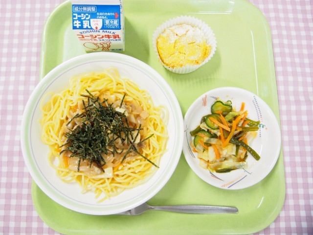 和風スパゲッティー、茎わかめのサラダ、米粉のキャロットケーキ、牛乳