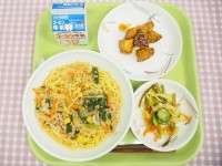ソース焼きそば、じゃがいもと大豆の磯辺揚げ、杏仁豆腐、牛乳