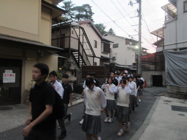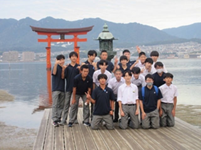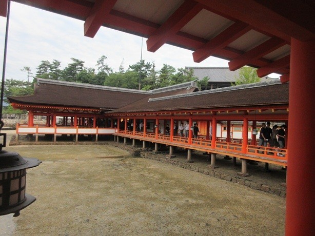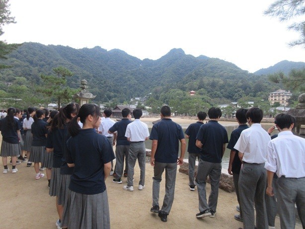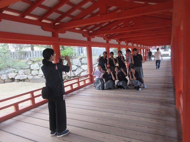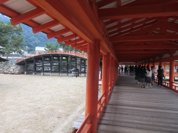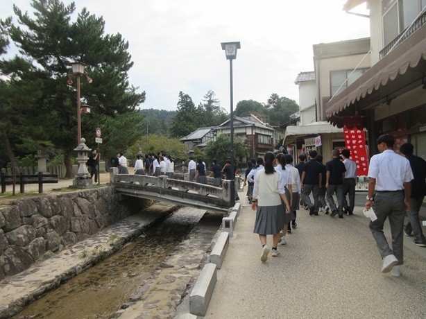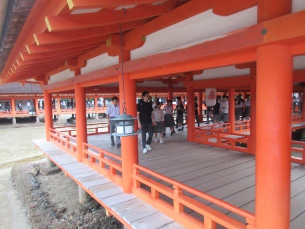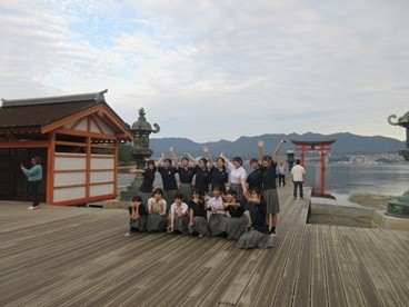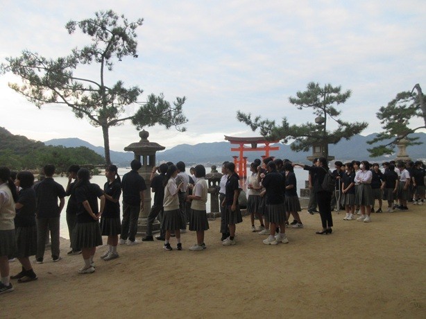 5:30起床で、早朝の厳島神社見学に行きました。修学旅行の学校が何校か見学に来ていました。早朝ですが皆元気でした。