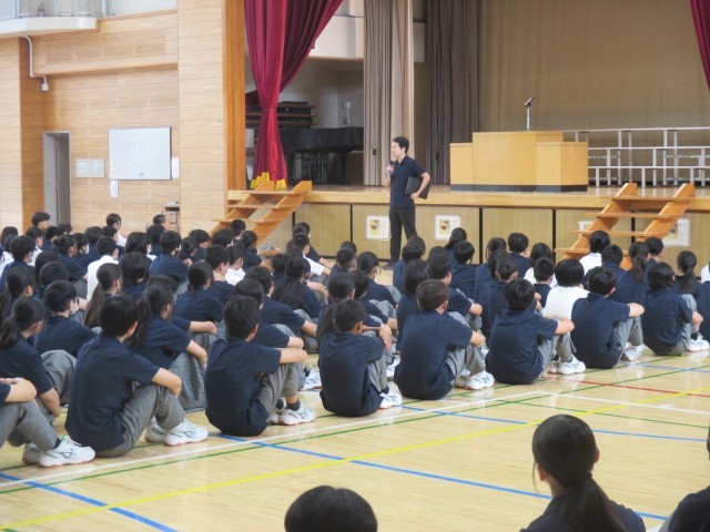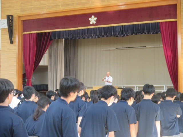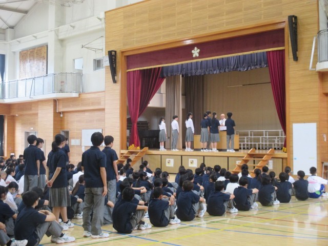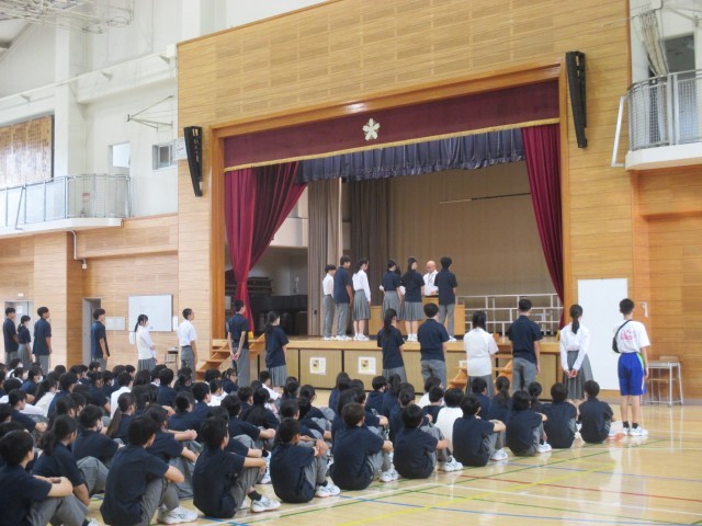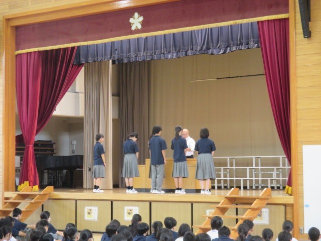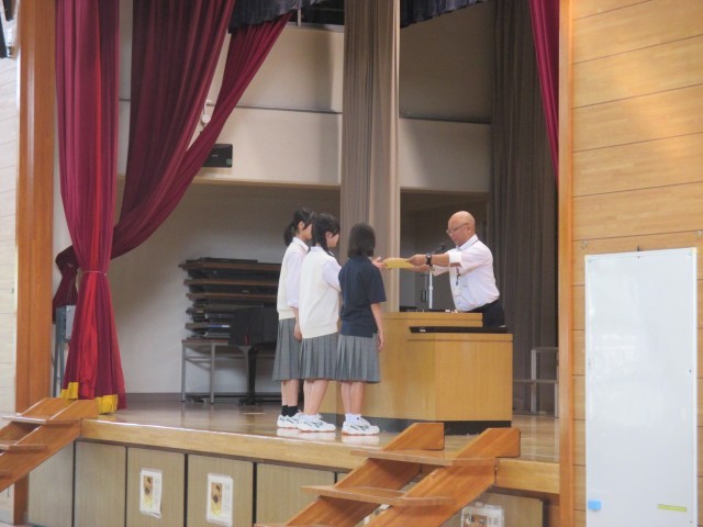 全校朝礼がありました。後期各委員の任命式と各部の表彰がありました。