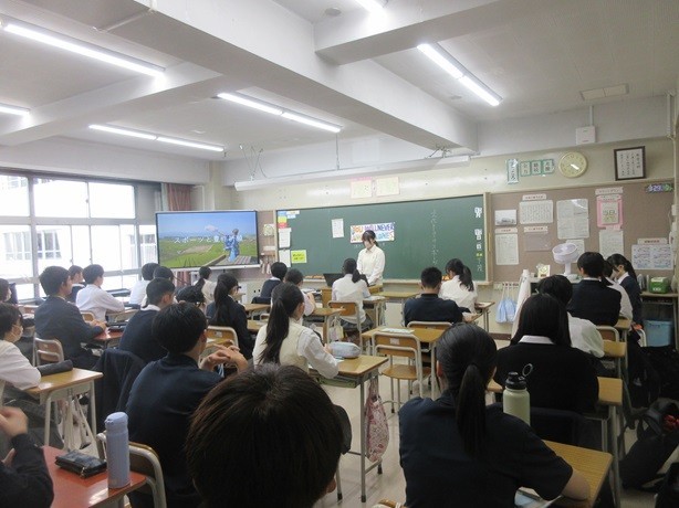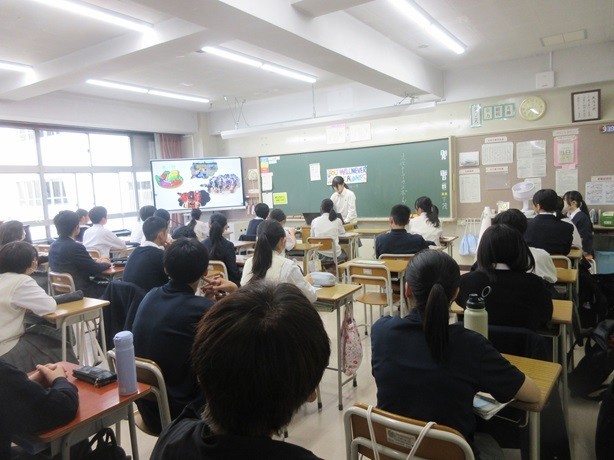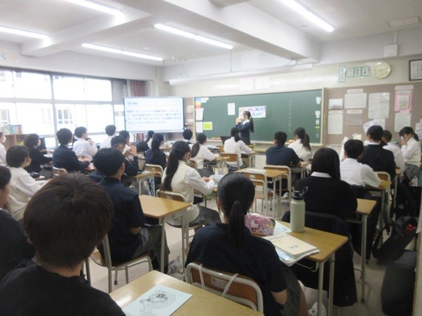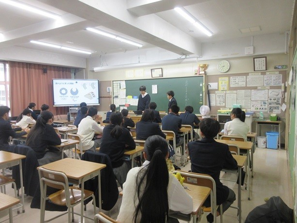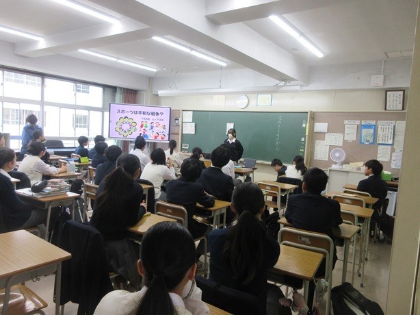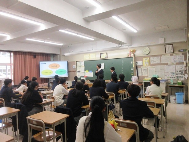 8年生の朝学活の時間に、保健体育の授業で9年生が行った探究学習を8年生の各クラスへ9年生が発表をしに来てくれました。