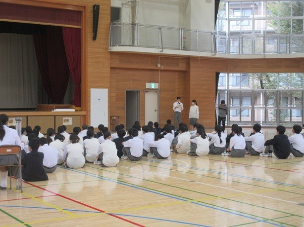 また、急に寒くなってきましたが登下校や学校生活での服装についてもお話がありました。1年間を通じて様々な組み合わせが可能ですが登下校などの服装の基本的な確認等がありました。ちなみに1年間「紺ポロ(半袖)」でも問題ないとのことでしたが・・・。