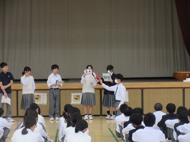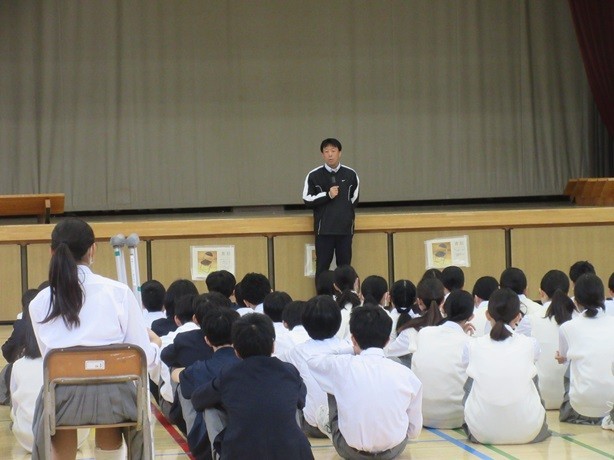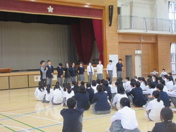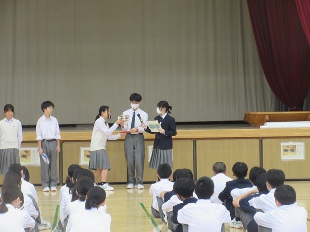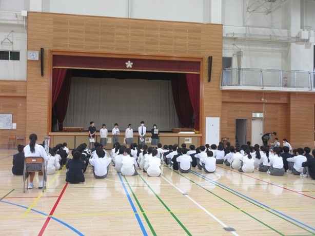 7年生の学年朝礼の様子です。保健委員から歯の磨き方について話がありました。普段の歯磨きや、学校の歯磨き週間の取り組みに生かしていきましょう!