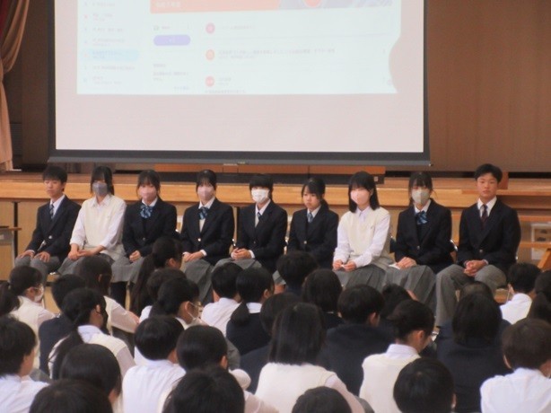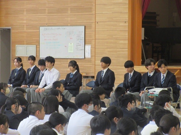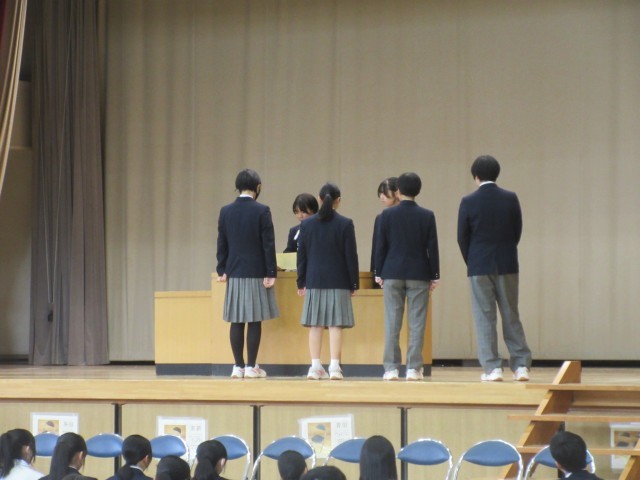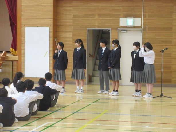 生徒会朝礼がありました。生徒会役員、各委員会、各部長が新たにスタートにあたって挨拶をしていました。8年生が中心に学校の様々なことを担って責任をもって取り組んでいます。8年生の立派な行動や取り組みに感謝です。