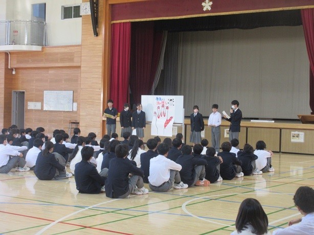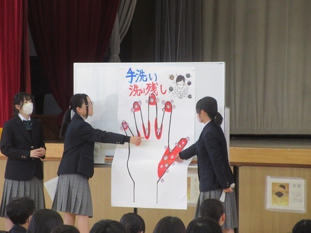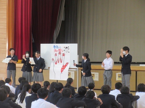 また、保健委員から手洗いチェックについて話がありました。専用の液体をつけてから手洗いを行い、その後ブラックライトを当てると洗い残しがわかる手洗いチェッカーを使ってやるそうです。これからの感染症流行にそなえて手洗いが大切になってきます。きちんとした手洗いができるようになるとよいです。