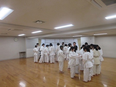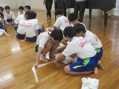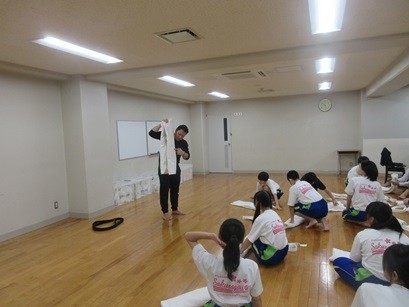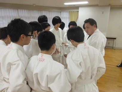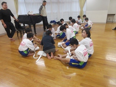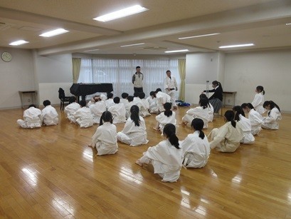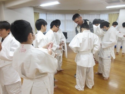 7年生の体育授業の様子です。武道の授業で柔道をおこないます。その授業開始に向けて道着の着方やたたみ方を全員で練習していました。