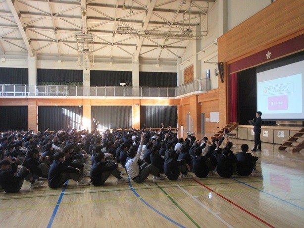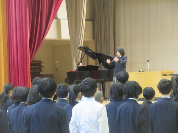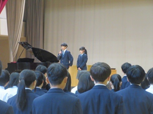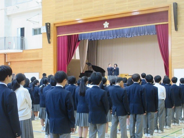 全校朝礼の様子です。今年度の校歌斉唱で指揮者・伴奏者をしていただいた9年生2人から、8年生へと変わる日でした。